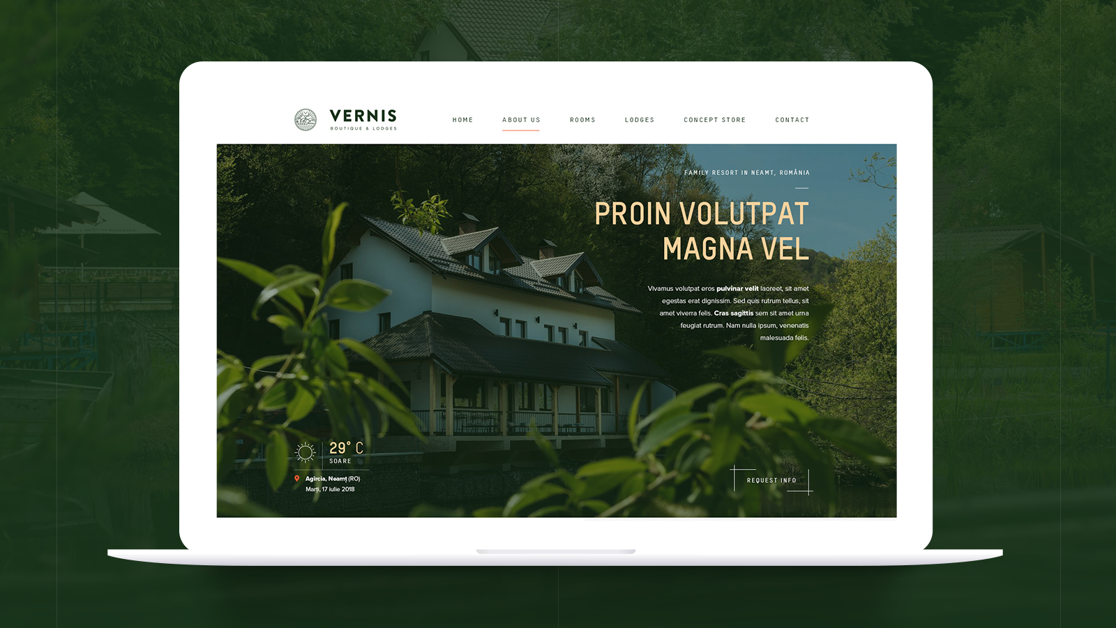 Vernis este un bed & breakfast unic, ce îmbină confortul modern cu frumusețea naturii. Cu un concept de boutique ce include mobilier și decorațiuni handmade, locația își propune să ofere o experiență autentică, unde vizitatorii se simt conectați la natură. Misiunea noastră a fost să capturăm acest spirit în designul site-ului, creând o interfață care să transmită căldura și unicitatea locului.
